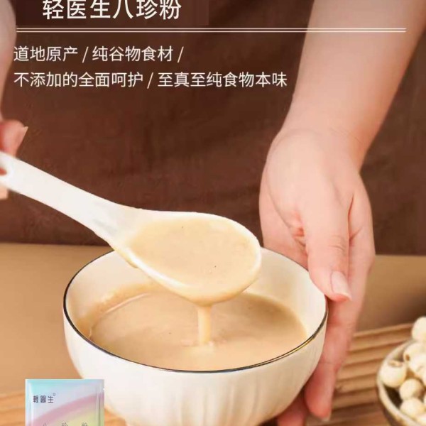 轻医生八珍粉采用古方配比,现代化技术提取浓缩,每包24克,开水冲调均匀即可食用。