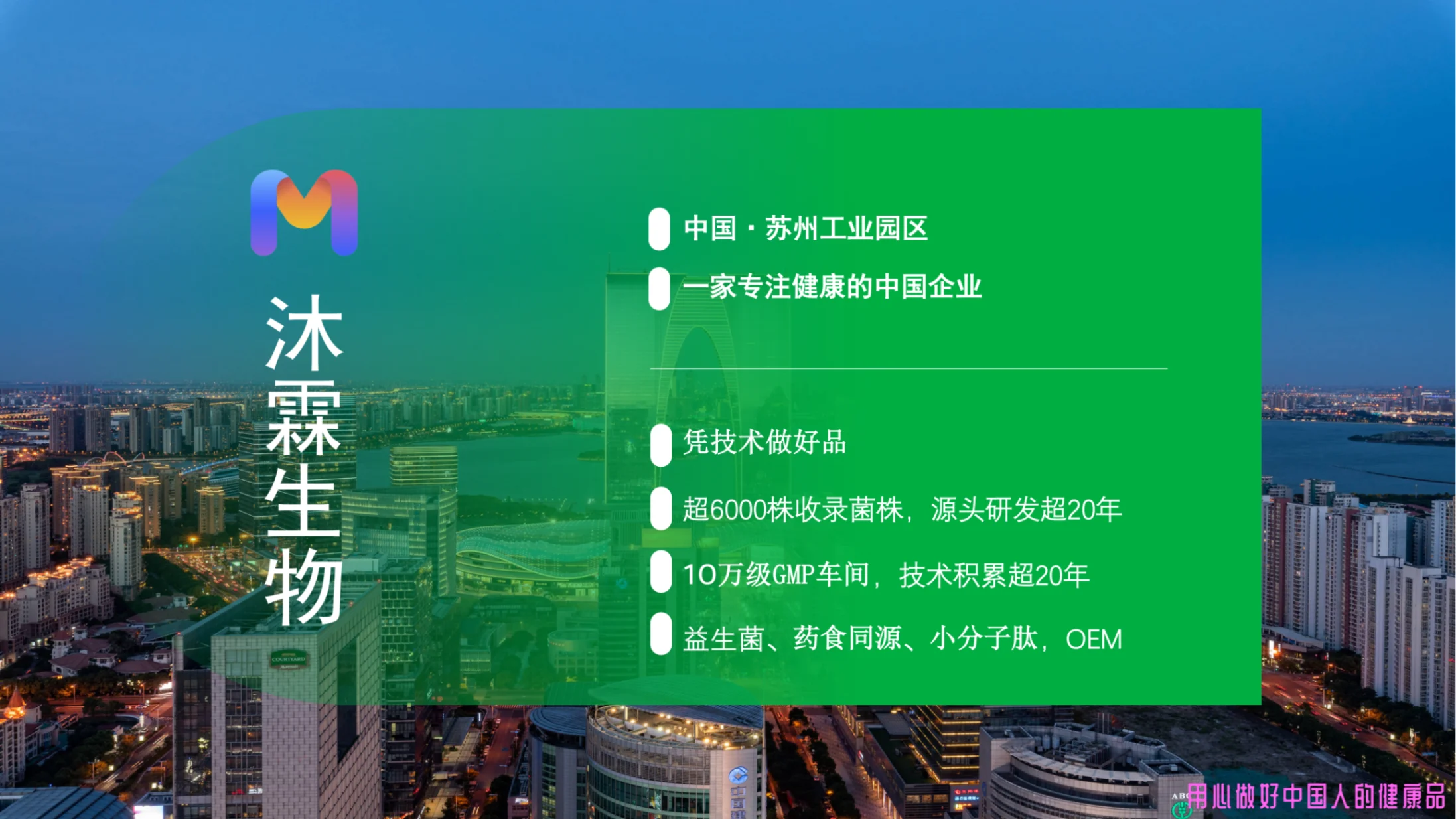 苏州沐霖生物科技有限公司是轻正医学旗下生物制剂生产企业,坐落于美丽的阳澄湖畔。公司主要生产益生菌、小分子肽、蛋白粉、口服美容、健康管理、体重管理等药食同源产品。公司拥有十万级净化生产车间和完善的研发检验中心,现代化的生产设施可达日产20万包的生产能力。沐霖人秉承“己所不欲勿施于人”的价值观,并坚守使命“努力十五年,服务一亿人!”来达成企业愿景“让健康触手可及!”